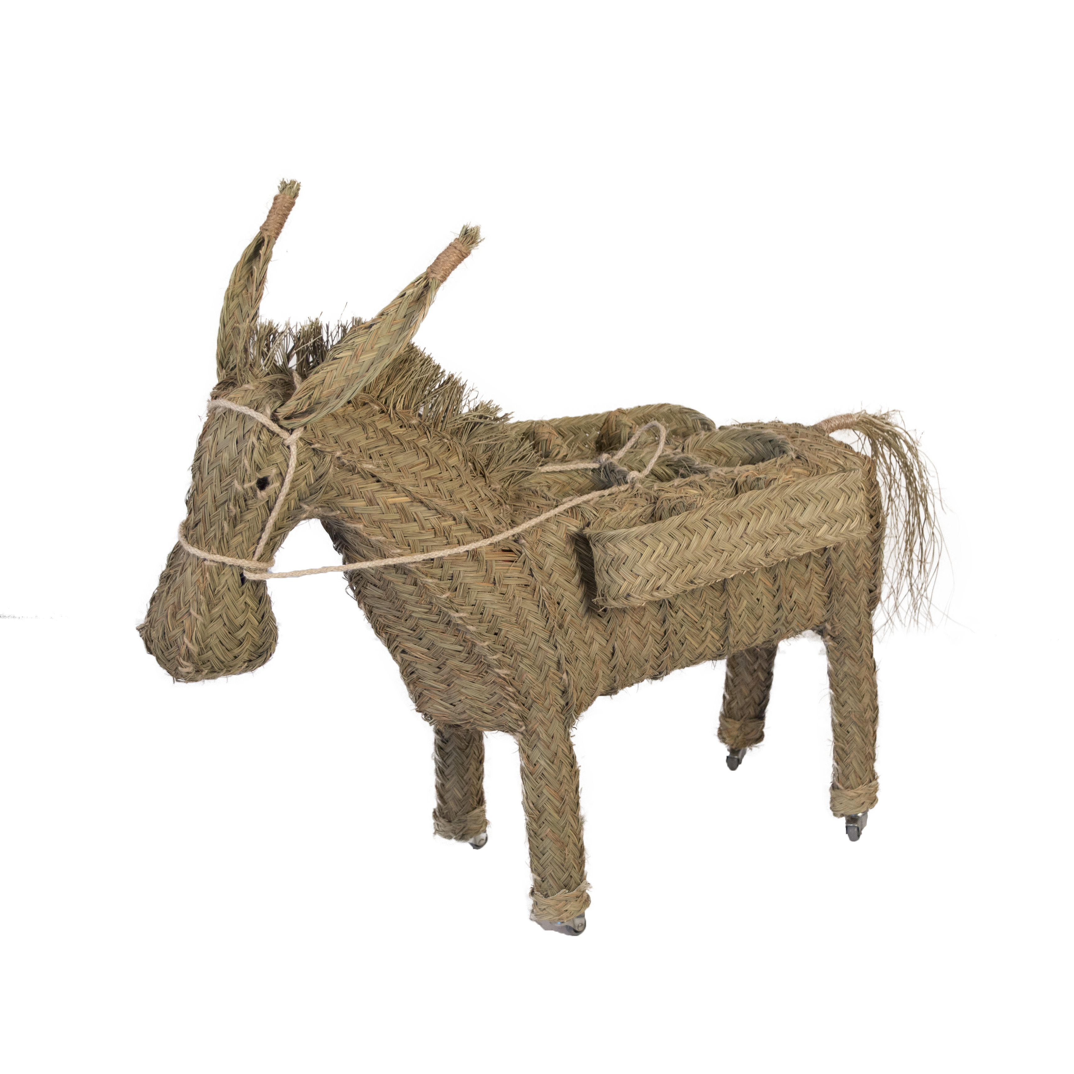 Burro bar de esparto cargado con sus alforjas y con unos detalles cuidados a la perfección para dar un toque encantador, artesano y natural al hogar. Perfecto para colocar las botellas en una fiesta o evento o como elemento decorativo en tu hogar. Es un producto hecho a mano nacional con una larga tradición y muy resistente además de práctico.