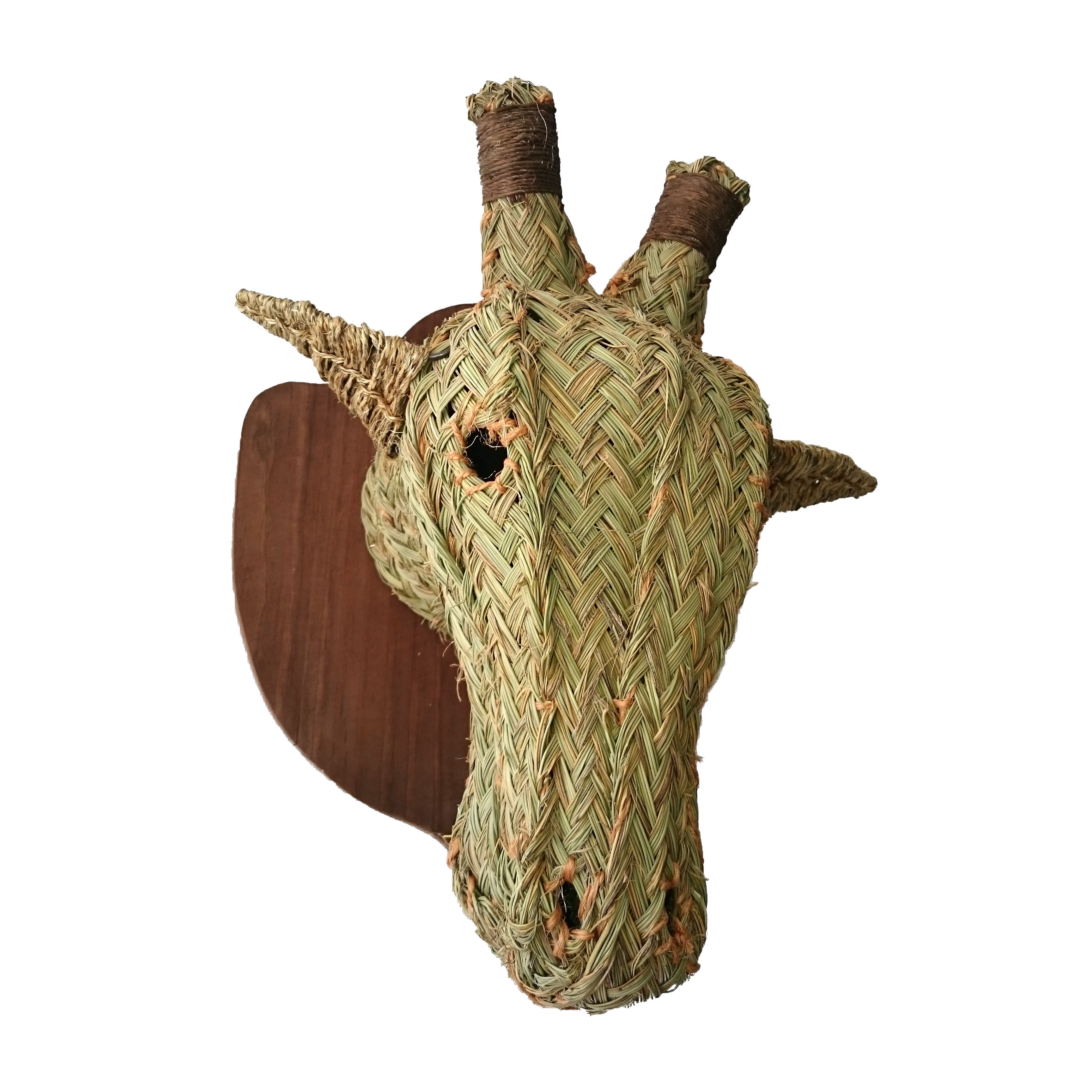 Trofeo de cabeza de jirafa de esparto y base de madera con unos detalles cuidados a la perfección para dar un toque encantador, artesano y natural al hogar o negocio. Es un producto hecho a mano nacional con una larga tradición y muy resistente además de práctico.