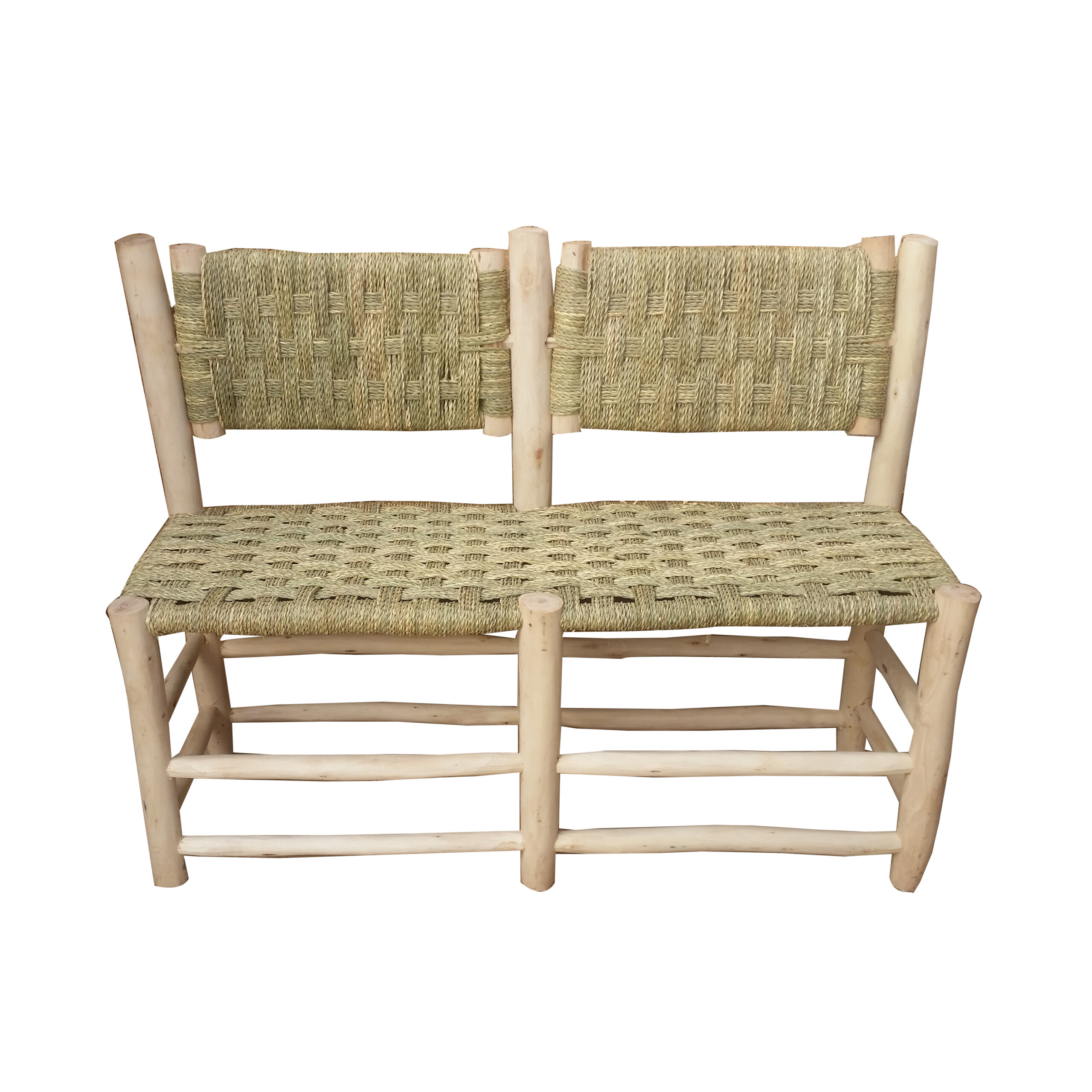 Banco de palmito con respaldo de dos plazas. Cómodo asiento para cualquier parte del hogar que da un toque natural. Es un producto hecho a mano nacional con una larga tradición y muy resistente además de práctico.