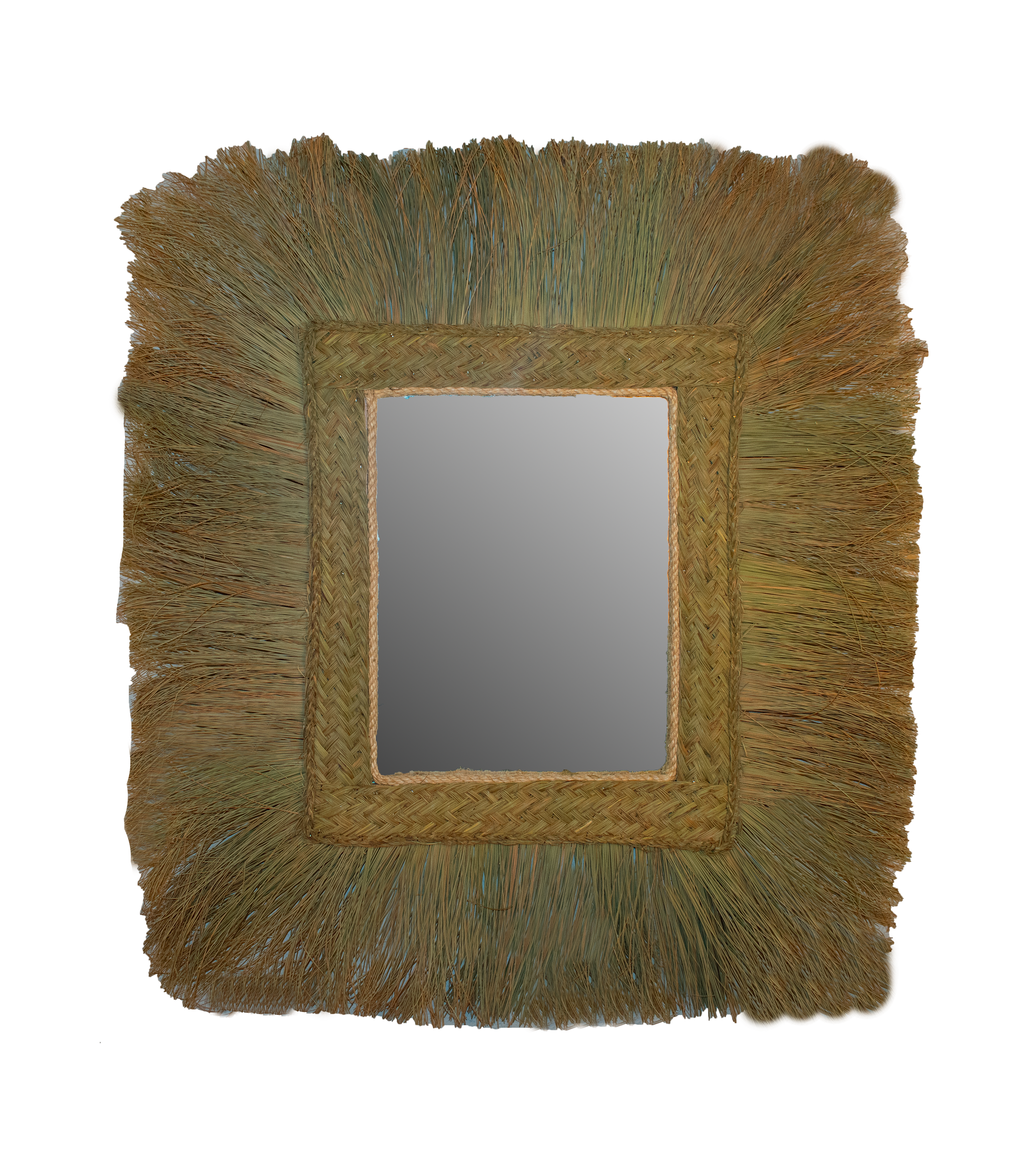 Espejo rectangular con flecos de esparto natural con armazón de madera maciza y espejo. Marco realizado con pleita de esparto. Es un producto hecho a mano nacional con una larga tradición y muy resistente además de práctico.