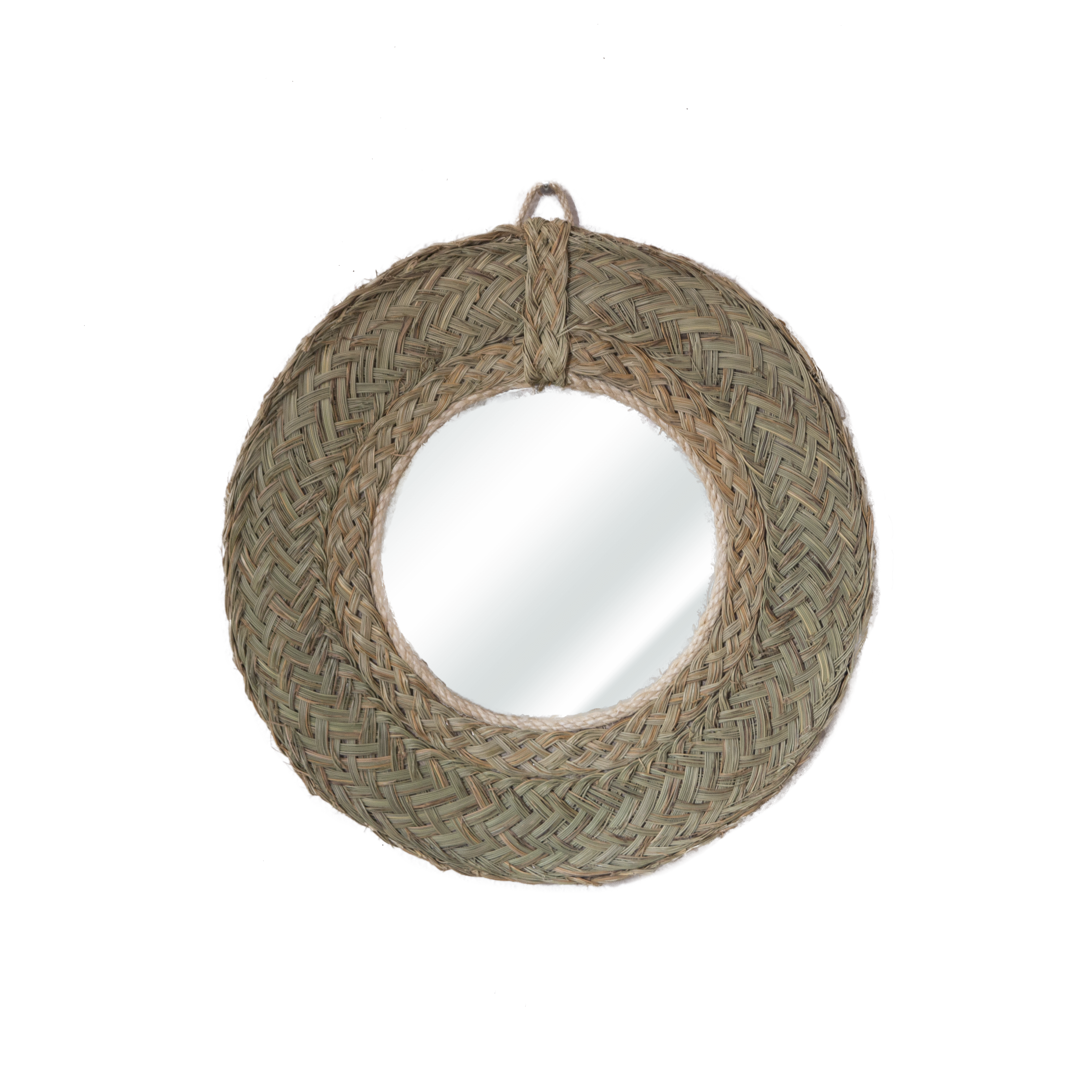 Espejo redondo de esparto natural con armazón de madera maciza y espejo. Marco realizado con pleita de esparto. Es un producto hecho a mano nacional con una larga tradición y muy resistente además de práctico.