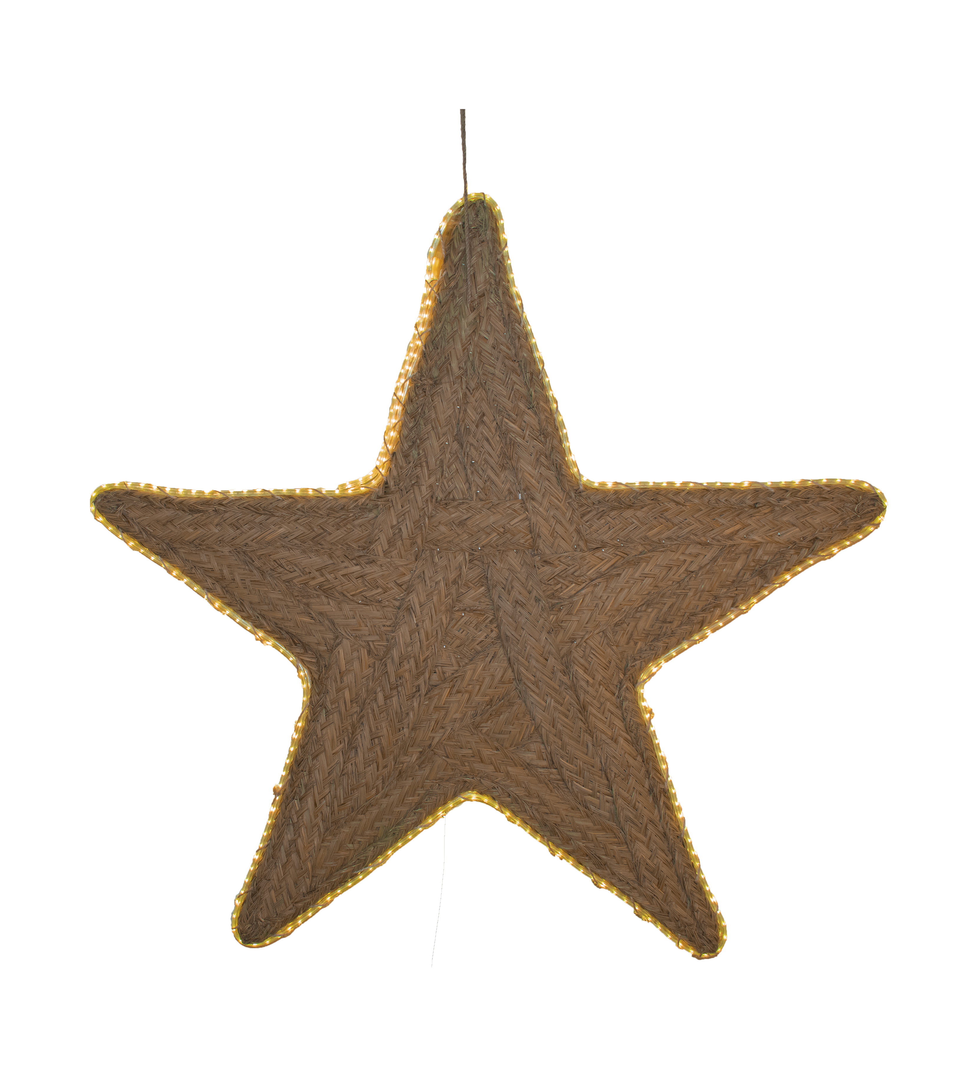 Estrella de Navidad de esparto con iluminación LED. Con una cuerda para poder colgarla. Elemento decorativo del hogar, negocio o evento para la época navideña. Es un producto hecho a mano nacional con una larga tradición y muy resistente además de práctico.