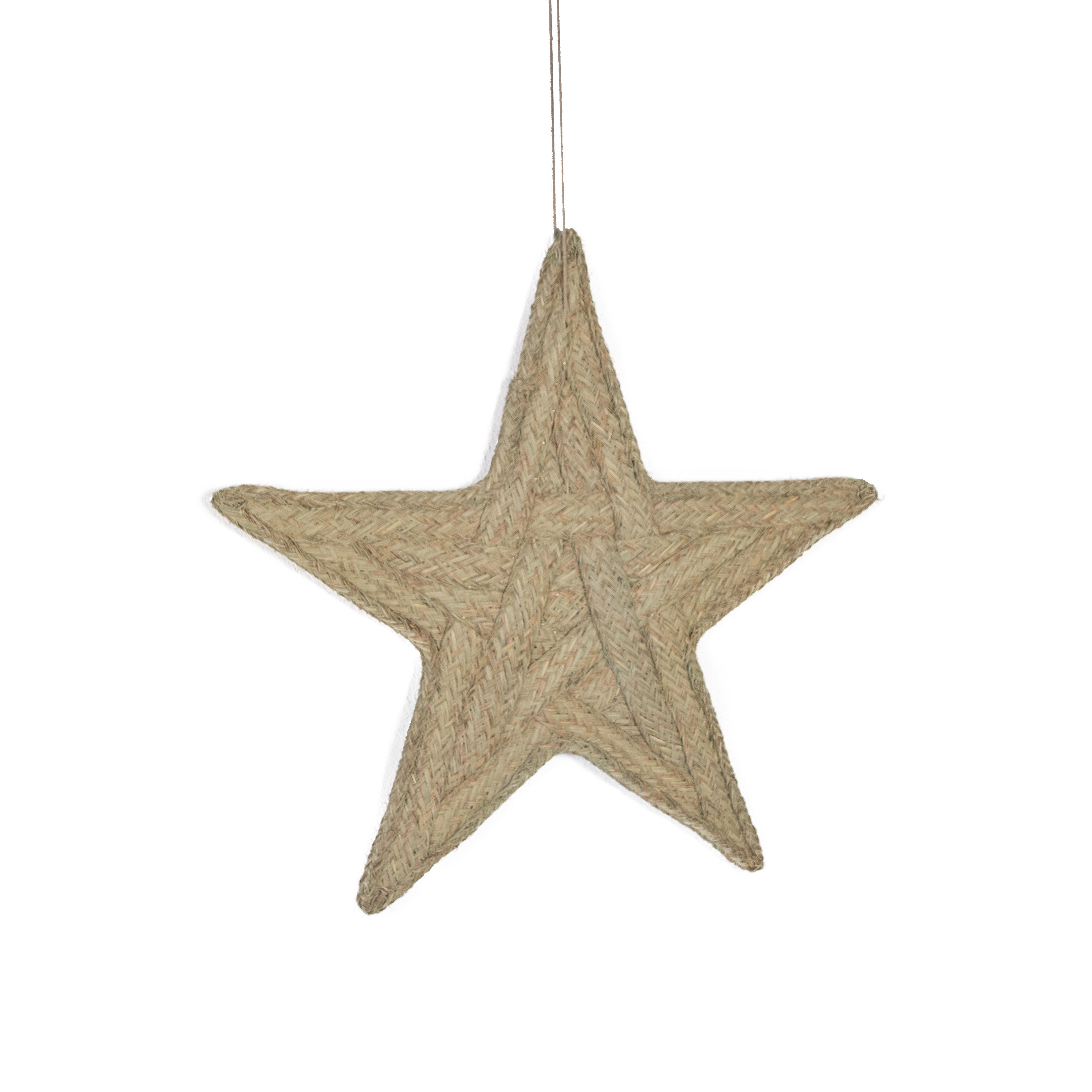 Estrella de Navidad de esparto. Con una cuerda para poder colgarla. Elemento decorativo del hogar, negocio o evento para la época navideña. Es un producto hecho a mano nacional con una larga tradición y muy resistente además de práctico.
