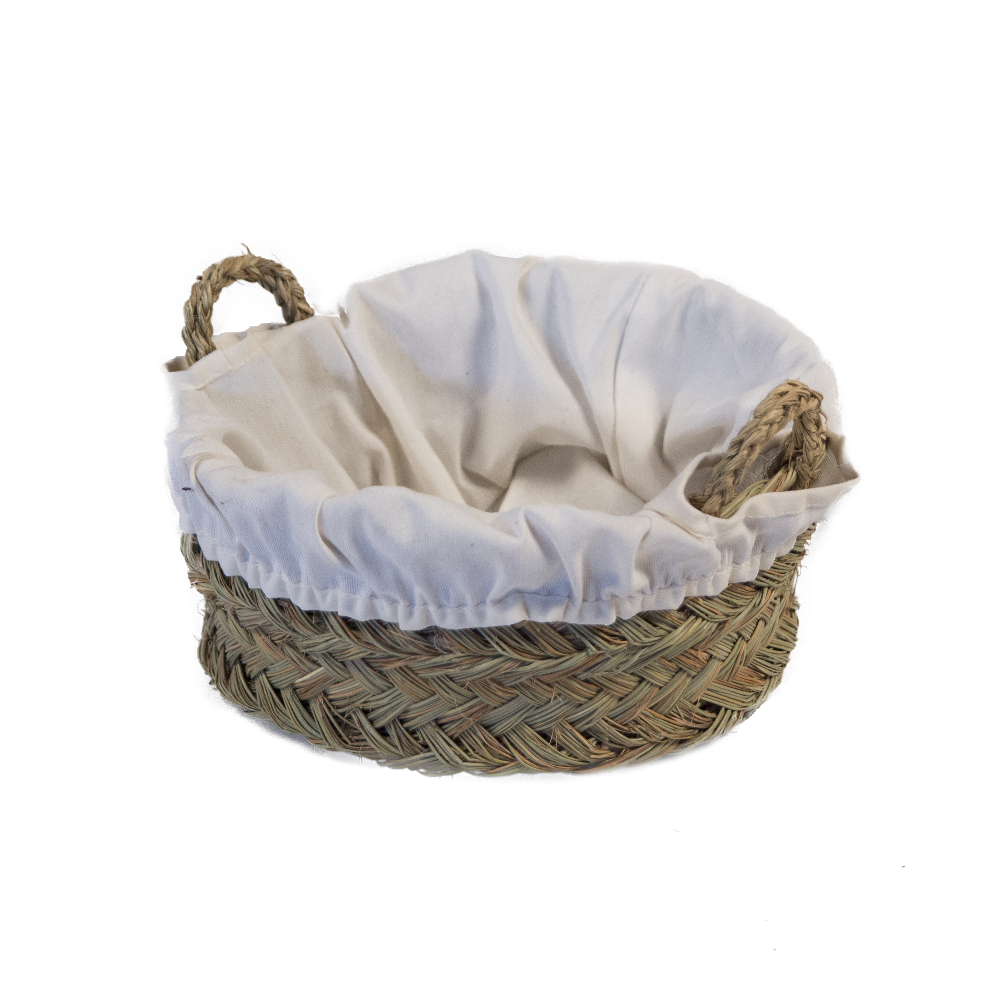 Panera redonda de esparto forrada con tela perfecta para el pan de centro de mesa o como cesto para cualquier producto. También puede ser usada como bandeja decorativa para el hogar. Es un producto hecho a mano nacional con una larga tradición y muy resistente además de práctico.